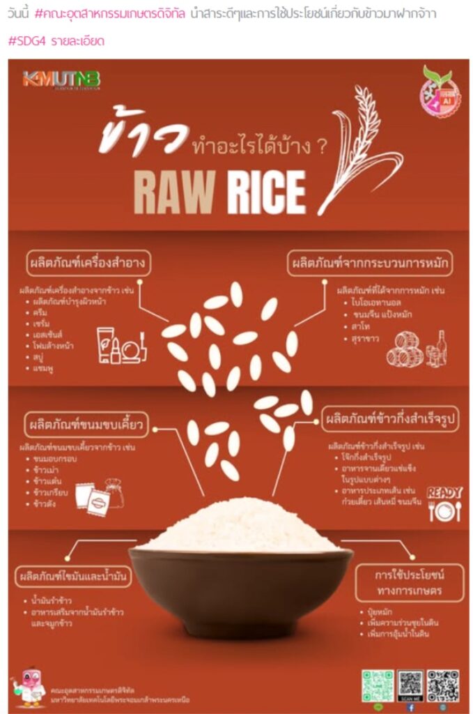 The Faculty of Agro-Industry at KMUTNB actively disseminates educational content, research information, and public learning activities through its online channels. These resources are freely accessible to anyone interested in topics such as sustainable food production, biotechnology, and agro-industrial innovation.